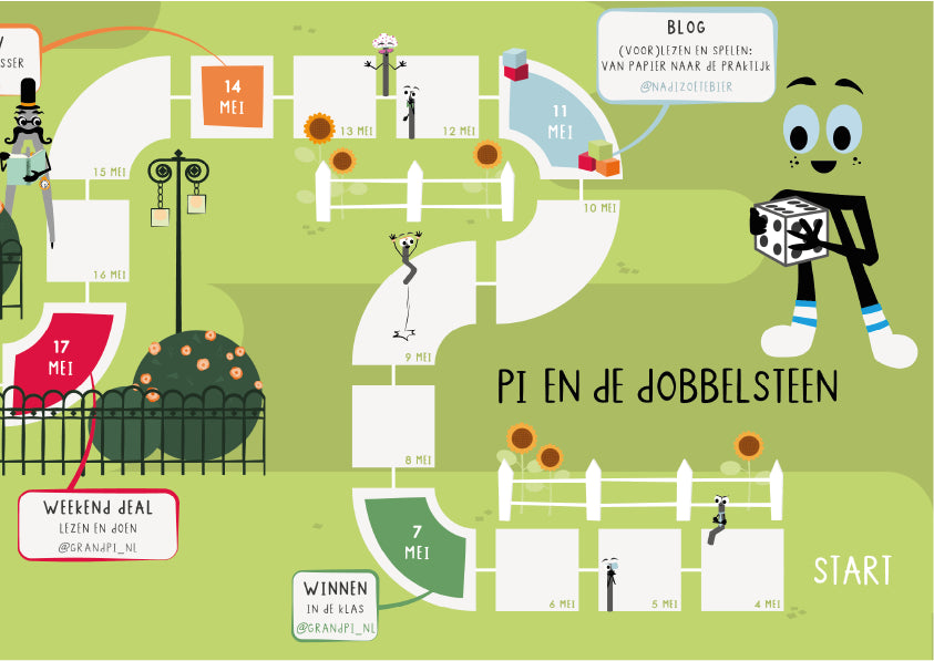 Bekijk roadmapMei 2024 stond in het teken van de online lancering van ons nieuwe boek "Pi en de Dobbelsteen". De lancering bestond uit een digitale roadmap vol met verschillende activiteiten. Ben je benieuwd naar alle interviews, blogs, posts en voorleessessies bekijk deze dan via onderstaande knop.