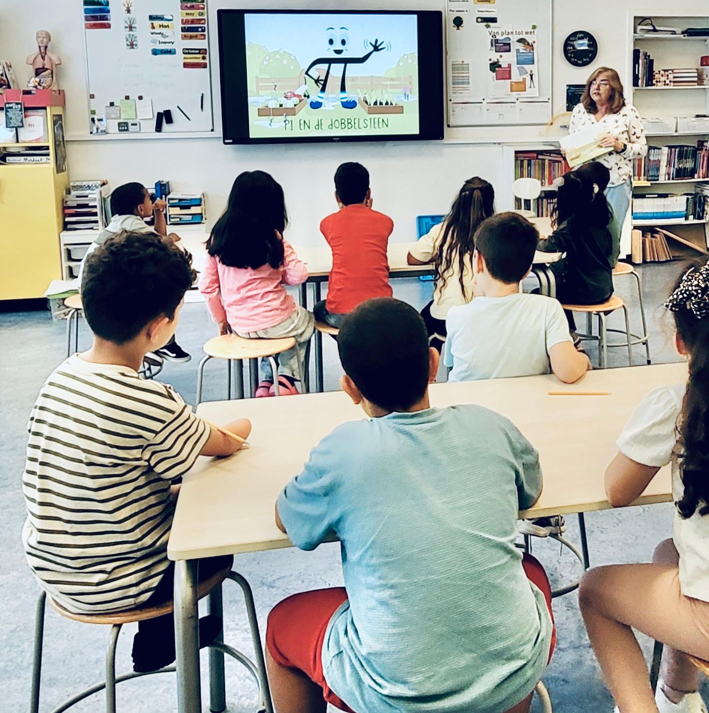 We beginnen met het voorlezen van het prentenboek "Pi en de dobbelsteen" in de klas. Het verhaal wordt op het scherm getoond, met kleine animaties voor extra beleving.
