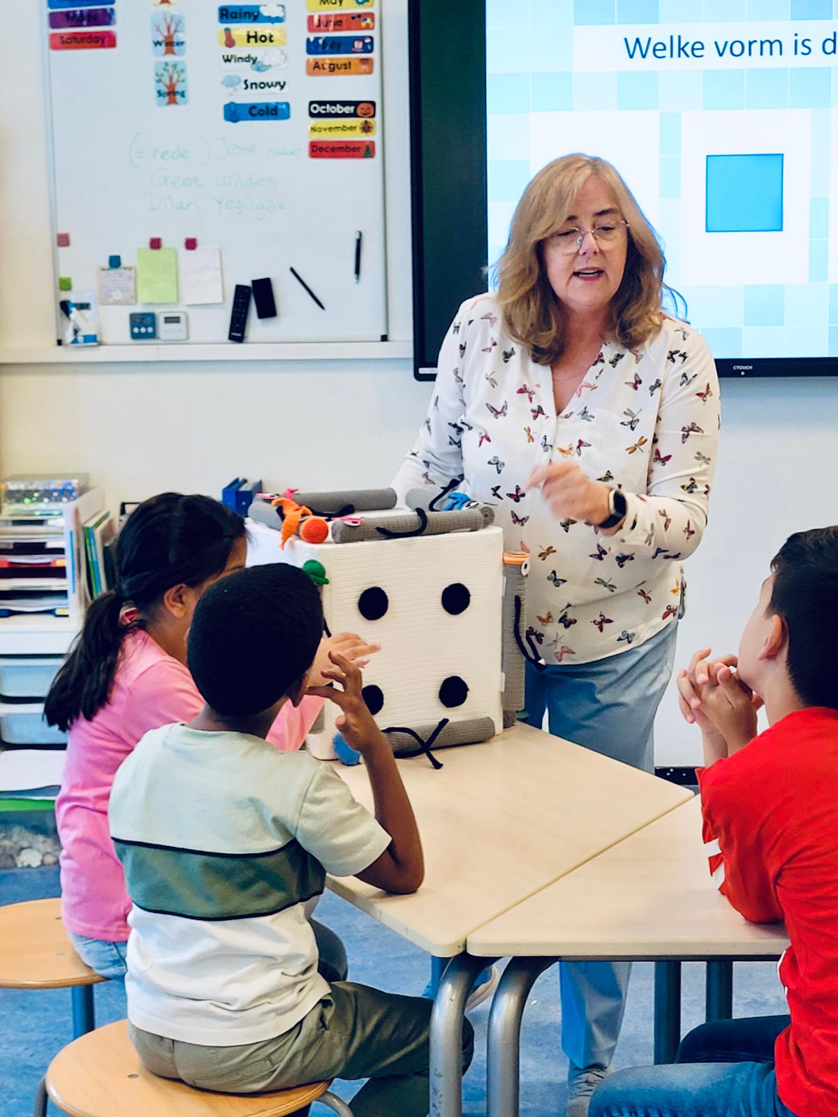 Daarna volgt een workshop waarin we gezamenlijk weer een dobbelsteen in elkaar zetten. We gaan opzoek naar de weggelopen ribbetjes, die verstopt zitten in de klas en maken samen de dobbelsteen weer compleet.